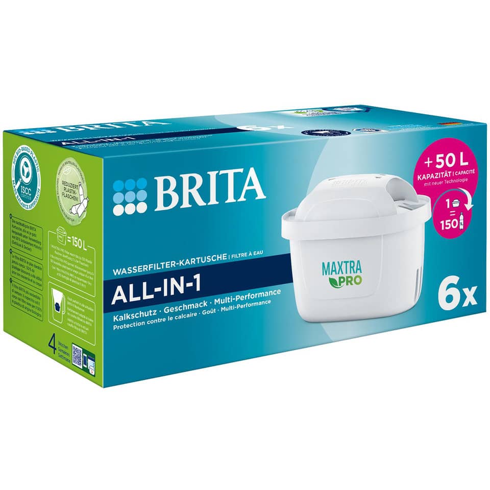 - Passend für alle BRITA Wasserfilter-Kannen & BRITA Flow: dank des bewährten BRITA PerfectFit-Systems deine Garantie für eine zuverlässige & vollständige Filtration. Vertraue dem Original: reines, frisch und lecker schmeckendes BRITA-gefiltertes Leitungswasser – schützt zudem Küchengeräte zuverlässig vor Verkalkung. Verbesserte Filtrationsleistung: Das innovative Hochleistungs-Filtergewebe reduziert Mikropartikel (Kleiner-Gleich 30 μm) 4x besser als die bisherige BRITA MAXTRA+ Filterkartusche – ideal für ältere Rohrleitungen. Doppelt smart! Mit der MAXTRA PRO bietet BRITA zwei Wasserfiltrationsexperten: den Alleskönner ALL-IN-1 & den Kalkexperten EXTRA KALKSCHUTZ für zusätzlichen Geräteschutz mit +50% effektiverer Kalkreduktion als die ALL-IN-1 Kartusche, besonders konzipiert für hartes bis sehr hartes Wasser. Mach mit – denn jede Plastikflasche zählt. Mit jedem BRITA-Produkt trägst du aktiv dazu bei, die Menge an Plastikflaschen zu reduzieren, die im Müll landen. 1 Liter BRITA gefiltertes Wasser verursacht 25 Mal weniger CO2 als Flaschenwasser aus Einwegplastik. Schütze unsere Umwelt – mit BRITA! BRITA bietet nachhaltige Trinkwasserlösungen und ist weltweit die Nr. 1 für Trinkwasserfilter. Qualität & Design aus Deutschland – seit 1966.