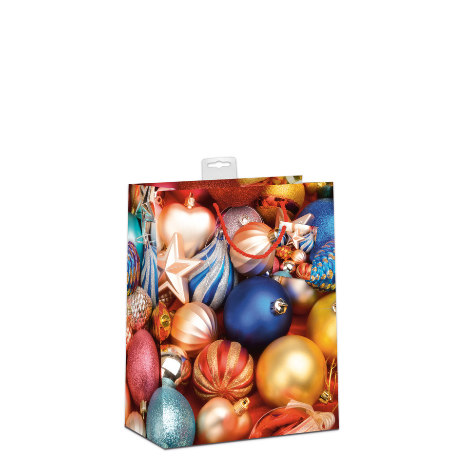 Die Weihnachts-Geschenktragetasche Kugeln hat die Maße 23 x 18 x 10 cm (ca. A5) und besteht aus glänzendem Papier (150g/m²). Sie ist mit Dispersionslack und hochwertiger Folienkaschierung veredelt und zeigt fünf festliche Kugel-Motive in sortierter Auswahl. Ausgestattet mit farbiger Kordel, Namenskarte und praktischer Eurolochvorrichtung, ist sie ideal für kleine, stilvoll verpackte Weihnachtsgeschenke.