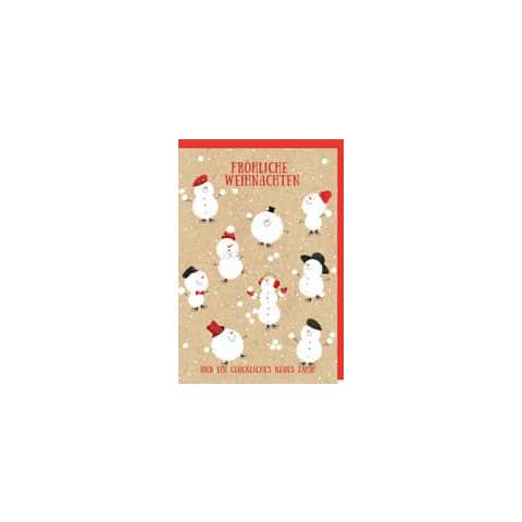 Diese bunte Weihnachtskarte im Format 11,5 x 17 cm besticht durch niedliche Schneemann-Motive auf naturfarbenem Hintergrund. Der Schriftzug „Fröhliche Weihnachten und ein glückliches neues Jahr!“ ist festlich in Rot gehalten und mit funkelndem Glitter veredelt. Die Karte wird inklusive rotem Umschlag geliefert und bietet Platz für persönliche Grüße. Ein liebevoll gestalteter Begleiter, der Winterfreude und festliche Stimmung verbreitet.