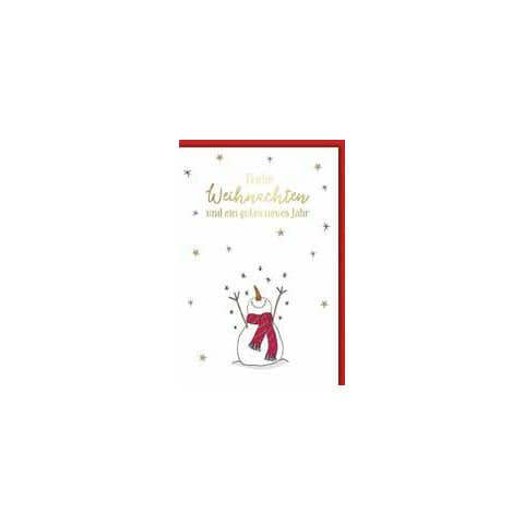 Verschenken Sie festliche Grüße mit der farbenfrohen Weihnachtskarte von BRAUN + COMPANY. Das 11,5 x 17 cm große, geprägte Motiv zeigt einen fröhlichen Schneemann und den goldfarbenen Schriftzug „Frohe Weihnachten und ein gutes neues Jahr“. Die Karte wird mit einem passenden roten Briefumschlag geliefert und eignet sich perfekt, um herzliche Weihnachtswünsche stilvoll zu übermitteln.