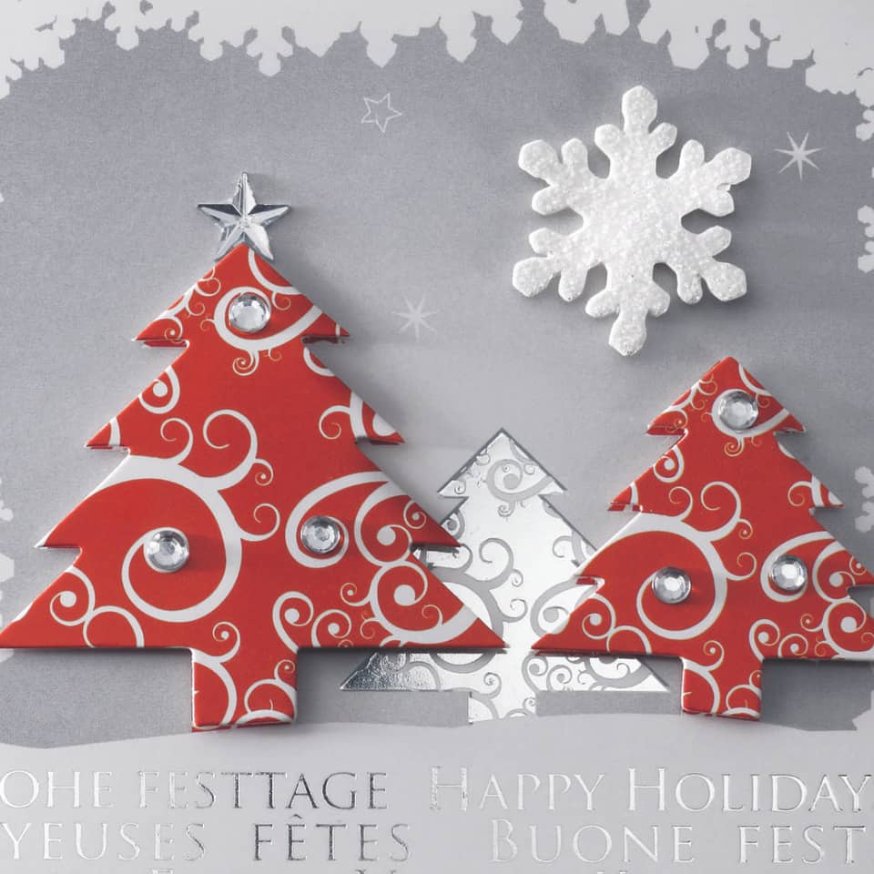 Mit einmaligem Motiv und ruck-zuck bedruckt: Handmade-Weihnachts-Karten "Three Trees" (Motiv: Weihnachtsbaum in silber) im Format A6 (Glanzkarton, 250 g/m², 10 Karten). Hochwertig veredelt: Silberprägung für eine Optik mit dem besonderen Etwas. Inkl. 10 passender, gummierter Umschläge. Überraschen Sie Geschäftspartner, Mitarbeiter, Kollegen oder auch Freunde und Familie mit exklusiven Grüßen zur Weihnachtszeit. Individuell und unkompliziert bedruckbar - für Ihre persönliche und einzigartige Weihnachtspost im Handumdrehen. Keine Abhängigkeit von Druckereien, geringe Auflagen ganz nach Bedarf - und das in Premiumqualität.