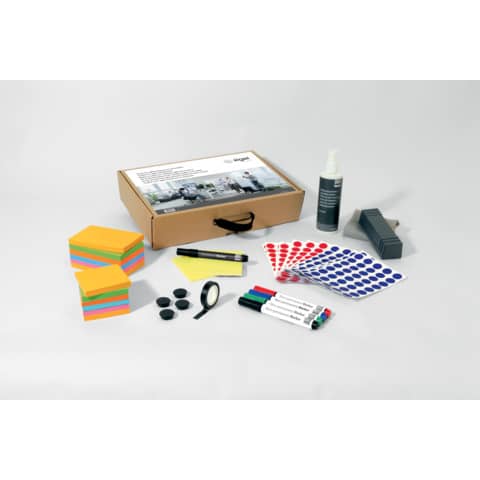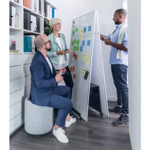 Mit Meet up wird Projekt- und Teamarbeit transparenter, flexibler und effizienter. Dieses vielseitige Starterset ist perfekt für spontane und unkomplizierte Meetings oder Workshops, auch ohne festen Besprechungsraum. Damit sind Sie bestens gerüstet, wenn Sie agile und kreative Arbeitsweisen anwenden, z. B. Brainstormings, Scrum, Kanban oder Design Thinking. Im Set sind enthalten: ein mobiles, beidseitig nutzbares Pinboard im Format 90x180 cm mit hochwertiger, robuster, grauer Stoffoberfläche und Aluminiumrahmen (ideal zum Anpinnen mit Pinnnadeln, Bekleben mit Haftnotizen und auch statisch haftend für Static Notes), ein mobiles, beidseitig nutzbares Whiteboard im Format 90x180 cm mit beschichteter, weißer Metalloberfläche und Aluminiumrahmen (ideal zum Beschreiben mit non-permanenten Markern, leicht abwischbar, statisch haftend für Static Notes, beklebbar mit Haftnotizen und magnethaftend), ein mobiler Stand/Aufsteller aus schwarzem MDF mit arretierbaren Rollen zur optimalen Platzierung der Boards (entweder ein Board mittig eingesteckt in den Schlitz oder zwei Boards in den Aluprofilen im Tent-Use), ein gratis Starterset. Meet up ist das Board-Komplettsystem für agiles und kreatives Arbeiten. Ideas to go. Anywhere. Anytime. Gratis Starterset (BA310): BA010 Board-Marker, BA240 Holz-Pinnnadeln, BA211 Holz-Magnete quadratisch, BA120 Holz-Board-Eraser inkl. Ersatzpad, BA110 Magnetisches Reinigungstuch, BA140 Reinigungsspray. Unverzichtbar bei jedem Meeting, Seminar oder Workshop