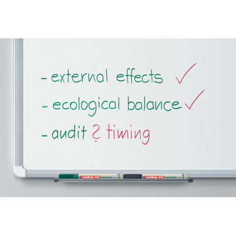 Boardmarker 28 EcoLine. Nachfüllbar. Geruchsarme Tinte ohne Zusatz von Butyl Acetat. Kann einige Tage offen liegen bleiben, ohne einzutrocknen. Rundspitze, Spitze austauschbar. Filtersystem. Kunststoffteile insgesamt zu mindestens 90 % aus recyceltem Material. Trocken abwischbar von fast allen geschlossenen Oberflächen. Ideal zum Schreiben auf Whiteboards. Kappe und Mundstück in Schreibfarbe. Kappe umsteckbar, Clip vorhanden. Schaftfarbe: umweltfreundliches Design. Strichstärke: 1,5 - 3 mm. Schreibfarbe: rot.
