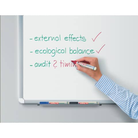Boardmarker 29 EcoLine. Nachfüllbar. Geruchsarme Tinte ohne Zusatz von Butylacetat. Kann einige Tage offen liegen bleiben, ohne einzutrocknen. Keilspitze, Spitze austauschbar. Filtersystem. Kunststoffteile insgesamt zu mindestens 90 % aus recyceltem Material. Trocken abwischbar von fast allen geschlossenen Oberflächen. Ideal zum Schreiben auf Whiteboards. Kappe und Mundstück in Schreibfarbe. Kappe umsteckbar, Clip vorhanden. Schaftfarbe: umweltfreundliches Design. Strichstärke: 1,5 - 5 mm. Schreibfarbe: grün.