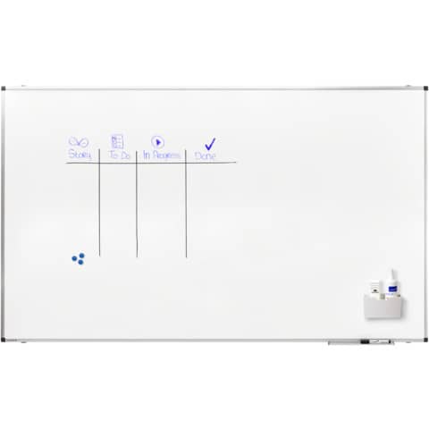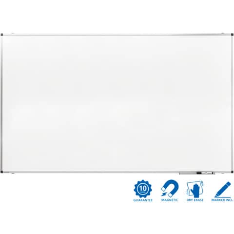 Robustes Whiteboard für den häufigen Gebrauch. Beschreibbar mit trocken abwischbaren Whiteboardmarkern. Magnetische Tafeloberfläche aus lackiertem Stahl. Aluminiumrahmen mit dunkelgrauen Kunststoffecken. Montage in waagerechter oder senkrechter Position mit Schrauben oder Blockmagneten (nicht im Lieferumfang) möglich. Lieferung mit Markerablage (30 cm), Boardmarker, Montageset und Montageanleitung.