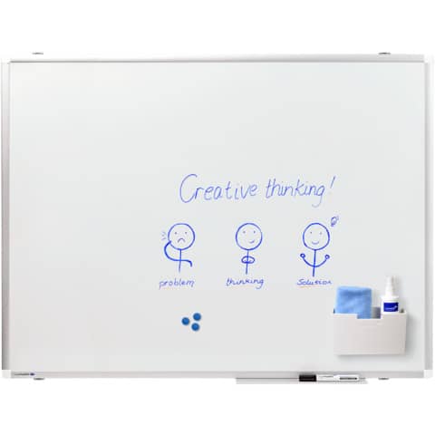 Hochwertiges kratzfestes Whiteboard für langfristige und intensive Nutzung. Beschreibbar mit trocken abwischbaren Whiteboardmarkern. Magnetische Oberfläche aus emailliertem e3-Keramikstahl, Cradle to Cradle Certified™, Bronze-Level. Aluminiumrahmen mit weißen Kunststoffecken. Montage in waagerechter oder senkrechter Position mit Schrauben oder Blockmagneten (nicht im Lieferumfang) möglich. Lieferung mit Markerablage (30 cm), Boardmarker, Montageset und Montageanleitung.