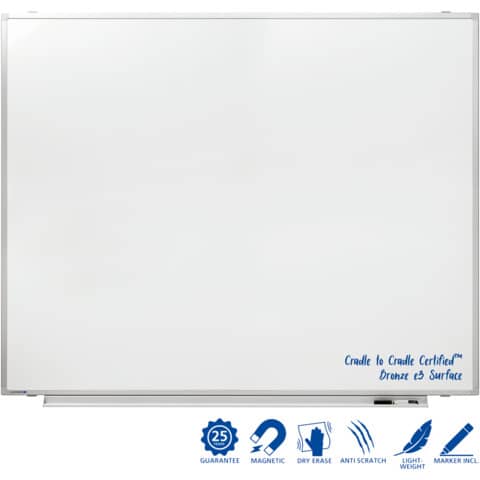 Hochwertiges leichtes und kratzfestes Whiteboard für langfristige und intensive Nutzung. Beschreibbar mit trocken abwischbaren Whiteboardmarkern. Magnetische Oberfläche aus emailliertem e3-Keramikstahl, Cradle to Cradle Certified™, Bronze-Level. Aluminiumrahmen mit hellgrauen Kunststoff-Eckkappen. Montage in waagerechter oder senkrechter Position mit Schrauben oder Blockmagneten (nicht im Lieferumfang) möglich. Lieferung mit Markerablage (Länge = Tafelhöhe), Boardmarker, Montageset und Montageanleitung.