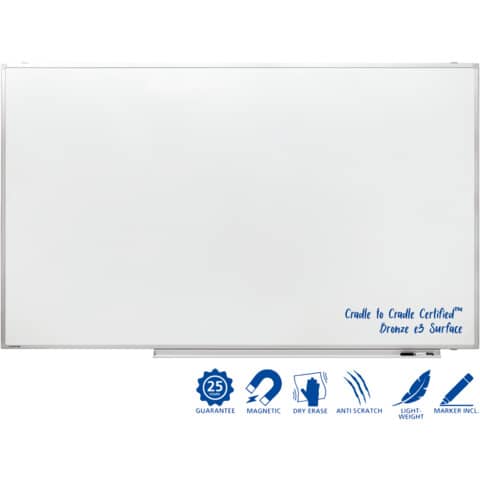 Hochwertiges leichtes und kratzfestes Whiteboard für langfristige und intensive Nutzung Beschreibbar mit trocken abwischbaren Whiteboardmarkern Magnetische Oberfläche aus emailliertem e3-Keramikstahl, Cradle to Cradle Certified™, Bronze-Level Aluminiumrahmen mit hellgrauen Kunststoffecken Montage in waagerechter oder senkrechter Position möglich Lieferung mit Markerablage (Länge = Tafelhöhe), Boardmarker, Montageset und Montageanleitung