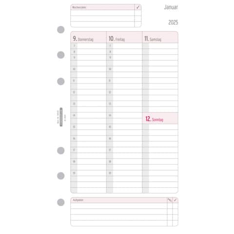 Kalendarium Wochenplan Midi 2025. Verwendung für Produkt: Chronoplan. Typbezeichnung: Midi. Verwendung für Kalenderjahr: 2025. Blattgröße (B x H) und Lochung: 96 mm, 172 mm, 6-Ring-Lochung. Packungsinhalt/Kalendarium: Vertikale Ausrichtung inkl. Jahresplan und zusätzliche Informationen, Formualare 80g/m² Papier, Jahresplan 120 m² Papier/Wochenpläne inkl. Jahresplan.