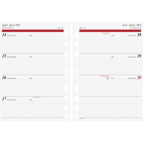 Blattgröße: 148 × 208 mm. 2 Seiten = 1 Woche. 128 Seiten, Druckfarbe: schwarz/burgund. 11-fach Universallochung, viersprachig: deutsch, englisch, französisch, italienisch. Jahresübersicht aktuelles Jahr und Folgejahr, zusätzlich Jahresplan aktuelles Jahr, 3-teilig, ausfaltbar, Monatsplan Folgejahr (1 Seite = 2 Monate), 9 Seiten Wissenswertes. Eckperforation.