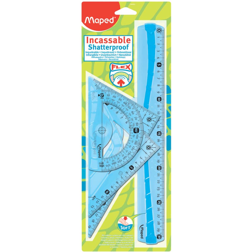 Geometrie-Set Maxi Flex, bruchfest, 4-teilig aus Kunststoff, Skalenaufdruck mit UV-beständiger Farbe, Inhalt: je 1 x Lineal 300 mm, Zeichendreieck 60 Grad 210 mm, Zeichendreieck 45 Grad 210 mm, Winkelmesser 180 Grad 120 mm, farbig sortiert in blau- und grün-transparent
