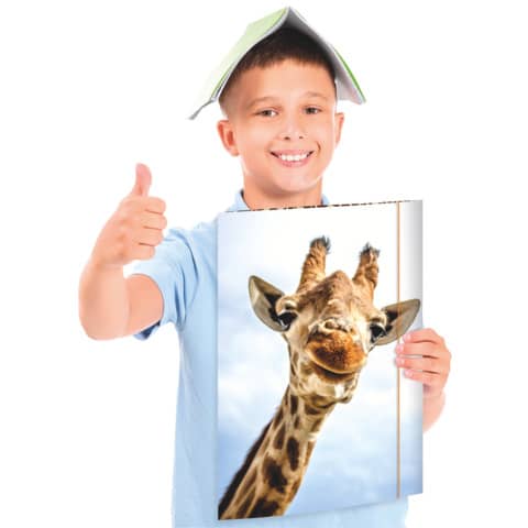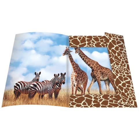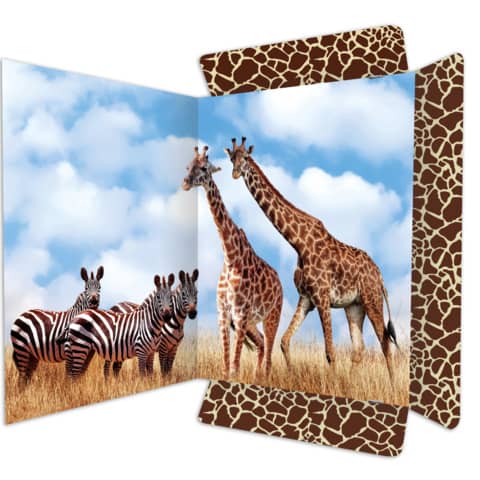 Sammelmappe, Zeichnungsmappe Zeichenmappe "Safari". 3 Klappen (Jurisklappen) am Unterdeckel vorhanden. Art des Verschlusses: Gummizug. Werkstoff: Karton. Flächenmasse des Papiers: 350 g/qm. Verwendung für Papierformate: DIN A3. Größe (B x H): 310 x 440 mm. Farbe: bunt. Typbezeichnung des Motivs: "Safari"