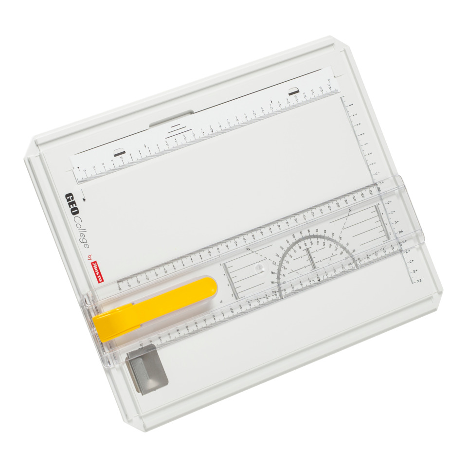 Die ARISTO College-Board Zeichenplatte für Blattformat DIN A4 ist die Basis- Version unter den ARISTO Zeichenplatten. ARISTO Zeichenplatten bestechen durch einfache und ergonomische Bedienung, hohe Stabilität und höchste Präzision beim Zeichnen. Die Parallel- Zeichenschiene ist mit 2 Skalierungen, einem Winkelmesser und einer Führung ausgestattet. Durch Betätigen der am Führungsgriff angebrachten Drucktaste kann die Zeichenschiene verstellt und an der gewünschten Position fixiert werden. Auf die Führungsstege der Parallel-Zeichenschiene kann Zeichenzubehör wie zum Beispiel das ARISTO Schnellzeichendreieck aufgesetzt werden. Der stabile Plattenkörper wird aus schlagfestem Kunststoff hergestellt. Eine Magnetklemmschiene mit Sichtfenster zur Kontrolle des Blattanschlages sowie eine zusätzliche Blattklemme sorgen für das Fixieren des Zeichenpapieres. Rutschfeste Noppen an der Plattenunterseite gewährleisten den perfekten Halt auf der Arbeitsfläche.