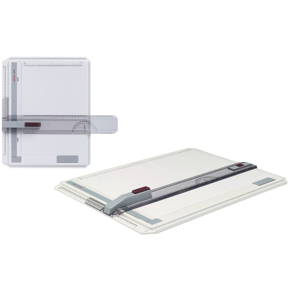 Zeichenplatte Profil. Material und Farbe: schlagfester Kunststoff, hellgrau. Freie Nullpunktwahl ja/nein, Parallel-zeichenschiene mit STOP-and -GO-Mechanik. Zur Verwendung der Schrägstellerfüße (Zubehör) geeignet. Für Format: A4. Packungsart/-inhalt: Karton 1St.