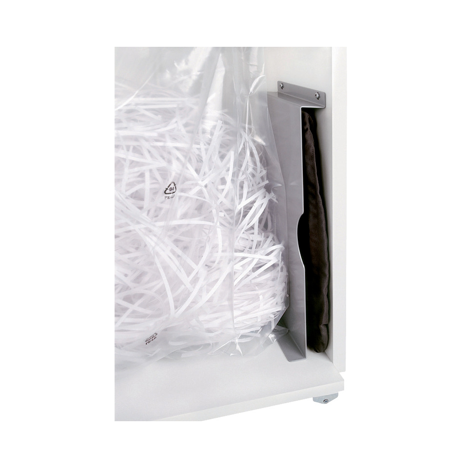 Mit Multifunktionsbedientaste und Reversiertaste. Auto-Reversierung bei Papierstau. Auffangvolumen: 82 Liter. Fahrbarer, leistungsstarker Aktenvernicher zum Einsatz am Arbeitsplatz. Sparsames Energiemanagement (EMCS). Angenehm dezentes Betriebsgeräusch. Füllstandsanzeige durch Sichtfenster. Mit ausziehbarem Mehrweg-Auffangbeutel. Made in Germany. Spannung/Frequenz: 230 V/50 Hz. Motorleistung: 500 Watt. Eingabebreite: 310 mm. Größe: 497 x 398 x 793 mm (B x T x H). Farbe: weiß.