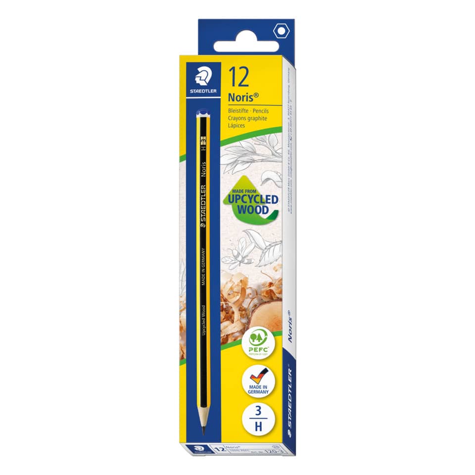 Bleistift Noris® 120 Bleistift, Ausführung der Schaftform: Sechskantform, gespitzt, Der perfekte Bleistift im klassischen Sechskantormat - Made from Upcycled Wood, Herstellung aus wiederaufbereiteten Holzspänen, Rutschfeste Soft-Oberfläche und hohe Bruchfestigkeit zum Schreiben,Zeichnen und Skizzieren, Erhältlich in 5 Härtegraden: 2B, B, HB, H, 2H, Holzanteil aus PEFC-zertifizierten, nachhaltig bewirtschafteten Wäldern, Spitzer Empfehlung: Noris Spitzdosen 511 004,511 120 oder Kunststoffspitzer 510 50 für ideale Spitzergebnisse, Nachhaltige Kartonverpackung im neuen Upcycled Wood Design, Härtegradkennzeichnung vorhanden, Länge: 176 mm, Farbe des Schaftes: gelb- schwarz, Bezeichnung der Härte: H.