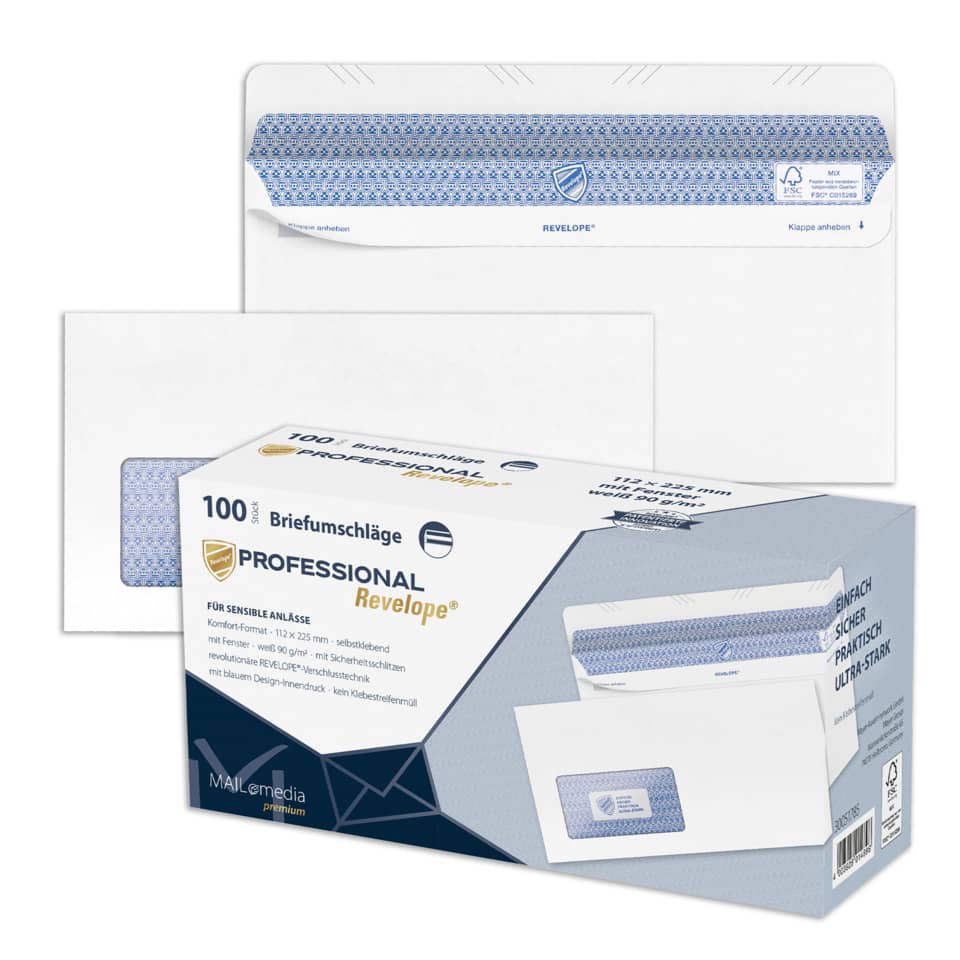 Briefumschlag Professional. Verschlusstechnik mit ultra-starker Klebkraft. Format des Umschlages: DIN Lang. Größe (B x H): 225 x 112 mm. Farbe: weiß. Ausführung: Revelope®, Fenster vorhanden, Innendruck vorhanden. Material und Papiergewicht: FSC®-zertifiziertes Papier, 90 g/qm. Ausführung des Inhalts der Packung: Packung mit 100 Umschlägen. Forest Stewardship Council (FSC).
