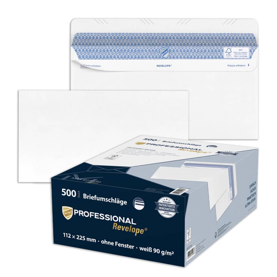 Briefumschlag Professional. Verschlusstechnik mit ultra-starker Klebkraft. Format des Umschlages: DIN Lang. Größe (B x H): 225 x 112 mm. Farbe: weiß. Ausführung: Revelope®, Innendruck vorhanden. Material und Papiergewicht: FSC®-zertifiziertes Papier, 90 g/qm. Ausführung des Inhalts der Packung: Packung mit 500 Umschlägen. Forest Stewardship Council (FSC).