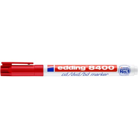 edding 8400 CD/DVD/BD marker. Zur dauerhaften Beschriftung von CD-Rohlingen, CD-ROMs, DVDs und Blu-ray Discs. Permanente, lichtbeständige und wischfeste Pigmenttinte auf Wasserbasis zum Schutz der Datenträgerschicht. Feine, weiche Rundspitze für hohen Beschriftungskomfort. Empfohlen von VERBATIM. Weißer Kunststoffschaft mit umsteckbarer Kunststoff-Clip-Kappe in Schreibfarbe. Strichstärke: ca. 0,5 - 1 mm. Schreibfarbe: rot.