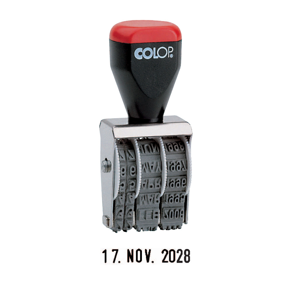 Der klassische Datumstempel von Colop hat eine Schrifthöhe von 4 mm und eine Abdruckbreite von ca. 24x4 mm.