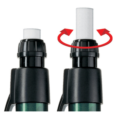 Besonderheiten: | Federnd gelagerte Mine Zurückgleitende Minenführung dadurch ständig bruchgeschützt Taschensicher durch voll versenkbare Mine Ergonomische Griffzone aus Gummi Herausdrehbarer Radiergummi |