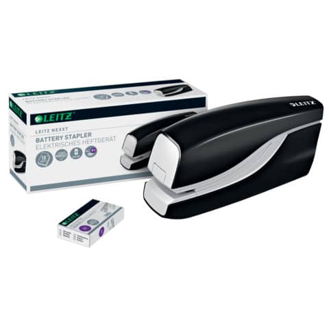 Leitz Elektrisches Heftgerät WOW. Mit Springfachmechanik. Für geschlossene Heftung. Batteriebetrieb (4 x AAA Batterien, nicht im Lieferumfang enthalten). Heftleistung: 1 mm/10 Blatt. Heftklammern: 100 x e1. Einlegetiefe: 10 mm. 3 Jahre Garantie nur bei Verwendung von Leitz Heftklammern, GS-geprüft, CE-Zeichen. Material: Metall mit Kunststoff. Farbe: schwarz.