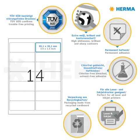 Eigenschaften "Etiketten Premium permanent, 99,1x38,1mm, 140 Stück, weiß HERMA 8635"
