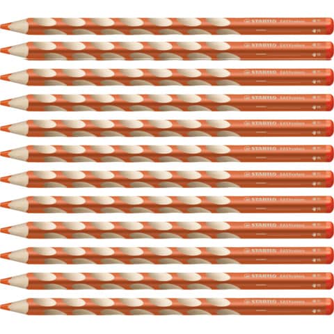 Ergonomischer Buntstift STABILO® EASYcolors. Ausführung der Schaftform: Dreikantform. Farbe des Schaftes: in Malfarbe. Material des Schaftes: PEFC Lindenholz. Schaft lackiert. Größe ( Ø x L): 9 x 175 mm. Für Rechtshänder - sichtbar durch roten Farbcode am Stiftende. Dreikantform und rutschfeste Griffmulden für eine entspannte Handhaltung. In Holz aus nachhaltiger Waldwirtschaft. Mit Namensfeld. Stärke der Mine: 4,2 mm. Schreibfarbe der Mine: orange.