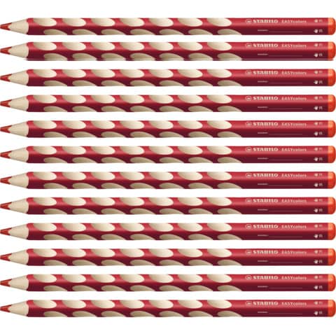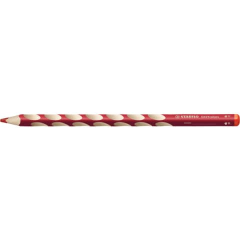 Ergonomischer Buntstift STABILO® EASYcolors. Ausführung der Schaftform: Dreikantform. Farbe des Schaftes: in Malfarbe. Material des Schaftes: PEFC Lindenholz. Schaft lackiert. Größe ( Ø x L): 9 x 175 mm. Für Rechtshänder - sichtbar durch roten Farbcode am Stiftende. Dreikantform und rutschfeste Griffmulden für eine entspannte Handhaltung. In Holz aus nachhaltiger Waldwirtschaft. Mit Namensfeld. Stärke der Mine: 4,2 mm. Schreibfarbe der Mine: rot.