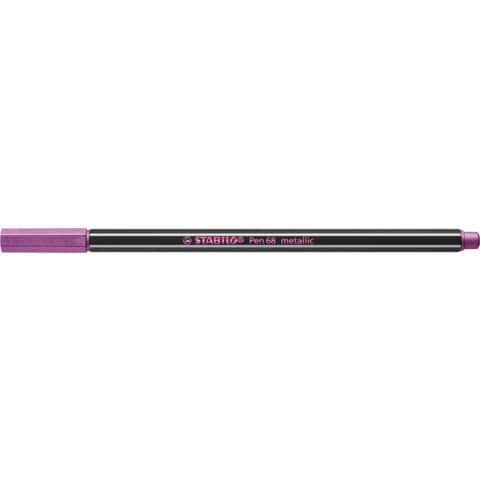 Premium-Filzstift STABILO Pen 68 metallic. Material des Schaftes: Kunststoff. Farbe des Schaftes: schwarz mit weißen Kantenstreifen. Kappe und Endstopfen in Schreibfarbe. Ausführung: Filzspitze, Spitze druckgesichert. Art der Schreibflüssigkeit: Tinte auf Wasserbasis, geruchsneutral. Metallisch-schimmernde Farben mit hoher Deckkraft auf weißem und farbigem Papier oder Karton. Die robuste M-Spitze sorgt für gleichmäßige Farbabgabe. Ventilierte Kappe - am Stiftende aufsteckbar. Strichstärke: 1,4 mm (M). Schreibfarbe von Schreibgeräten: metallic Violett.