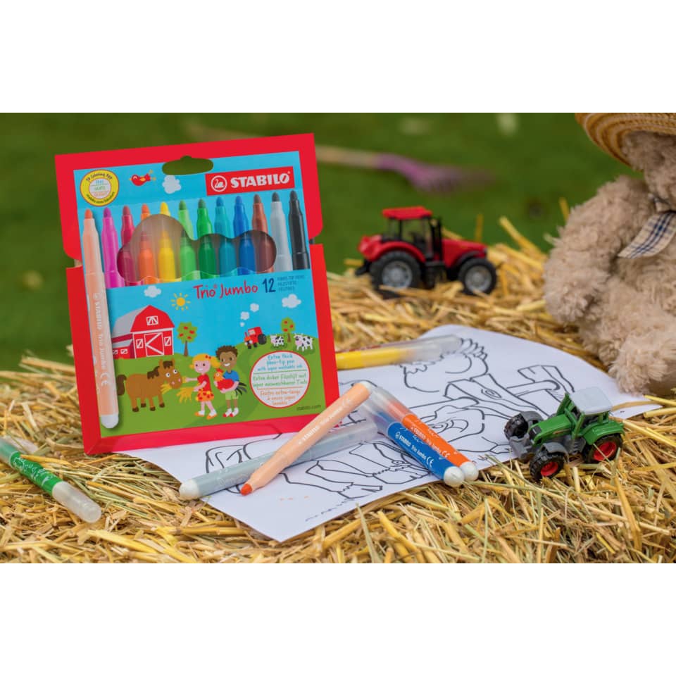 Extradicker Filzstift STABILO® Trio® Jumbo, STABILO® Trio® Jumbo. ergonomische, dreieckige Griffzone ermöglicht eine korrekte, ermüdungsfreie Stifthaltung. Venzilierte Kappe, am Stiftende aufsteckbar. Super-auswaschbare Tinte schon ab 40 °C. Ausführung Schreibflüssigkeit: Tinte auf Wasserbasis, Tinte auf Wasserbasis, super auswaschbar, Schreibfarbe von Schreibgeräten: sortiert, sortiert. Ausführung Schreibspitze: Ausführung der Spitze: extradicke XL, Strichstärke: 3,0 mm, 3,0 mm. Ausführung Schaft: Farbe des Schaftes: wie Tintenfarbe, in Malfarbe. Material des Schaftes: Kunststoff, Kunststoff. Ausführung des Inhalts mit Packung: Kartonetui mit 12 Stiften, Kartonetui mit 12 Stiften, Zertifikat/Zulassung: DAA603, DAA603