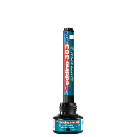 Flipchartmarker edding 383. Nachfüllbar. Geruchsneutrale Tusche auf Wasserbasis. Kann einige Tage offen liegen bleiben, ohne einzutrocknen. Keilspitze, Spitze austauschbar. Kunststoffschaft. Kappe umsteckbar, Clip vorhanden. Schaftfarbe: türkis. Strichstärke: 1 - 5 mm. Schreibfarbe: rot.