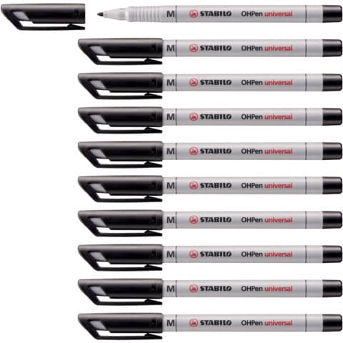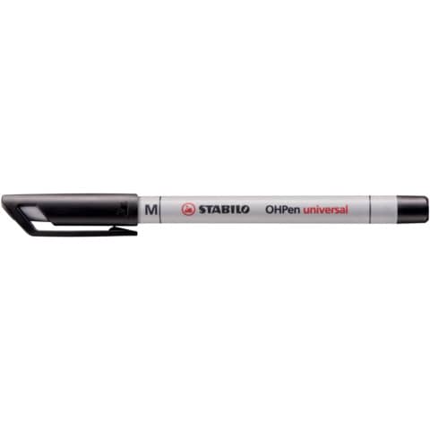 Feinschreiber Folienstift STABILO® OHPen universal. Typbezeichnung der Mine: Kapillarspeicher. Ausführung Spitze: Faserspitze, Medium (M) 1 mm, geeignet für Schablone. Art der Schreibflüssigkeit: geruchsarm, auf Alkoholbasis, schwarz. Schreibt auf fast allen glatten Oberflächen. Ausführung der Griffzone: rutschfest. Farbe der Kappe: schwarz. Material des Clips: Kunststoff. Farbe des Schaftes: hellgrau.