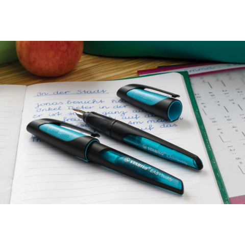schwarz/himmelblau Ergonomischer Schulfüller STABILO® EASYbuddy. Material der Schreibfeder: Stahlfeder (Iridium-Korn). Ausführung Tintenpatrone: Standardpatrone, königsblau (löschbar). Material des Schaftes: ABS (Kunststoff). Ausführung der Griffzone: Soft-Griffzone aus rutschfestem Material - sowohl für Rechts- als auch für Linkshänder geeignet. Ausführung Clip: Kunststoff, schwarz. Feder durch neues Griffstück leicht auswechselbar. Ausführung der Feder: eingefasste Feder (M) zum Schutz vor blauen Fingern. Empfohlenes Mindestalter: 7 Jahre. Ausführung des Inhalts mit Packung: 1 Füller inkl. 1 Standardpatrone.
