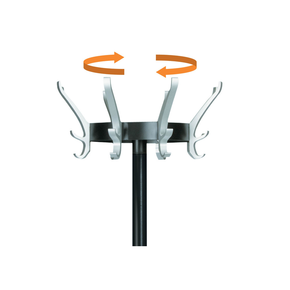 Standgarderobe im klassischen Stil mit 8 Dreifach-Kleiderhaken. Ideale Nischenlösung dank drehbarem Kopfring. Schirmhalter: ja, für bis zu 6 Stockschirme. Kopf: drehbar. Durchmesser: 35 cm. Höhe: 178 cm. Gewicht: 8,8 kg. Material: epoxidbeschichteter Stahl, Aluminium, Kunststoff (PP).