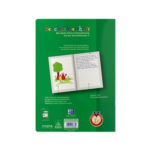 A4 Geschichtenheft, 16 Blatt. OPTIK PAPER® für leichtes Schreiben und optimale Schreibergebnisse. Lineatur 3 mit Rand rechts, reduzierte Hilfslinien unterstützen optimal die Schreibentwicklung. Extra robuster, veredelter Umschlag für dauerhaft optimale Nutzung. Mit Löschblatt um überschüssige Tinte aufzunehmen. Rückendraht geheftet um alle Seiten optimal beschreiben zu können. Durch umweltverträgliche Herstellung & Produktgüte ausgezeichnet mit dem anerkannten EU - Ecolabel.