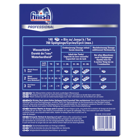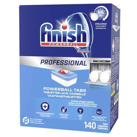 Finish Professional Spülmaschinentabs 140 Finish Tabs. Finish Professional Powerball Tabs wurden speziell für gewerbliche Spülmaschinen mit einer Spüldauer von 1-5 Minuten und manueller Dosierung entwickelt. Finish Professional Powerball Tabs erzielen schnelle Ergebnisse für ein sauberes und glänzendes Spülergebnis auf Ihren Gläsern, Ihrem Geschirr und Besteck. Die kraftvolle und phosphatfreie Formel bekämpft wirkungsvoll hartnäckige Verschmutzungen wie Kaffee, Tee, Wein sowie angetrocknete Speisereste und Lippenstift.