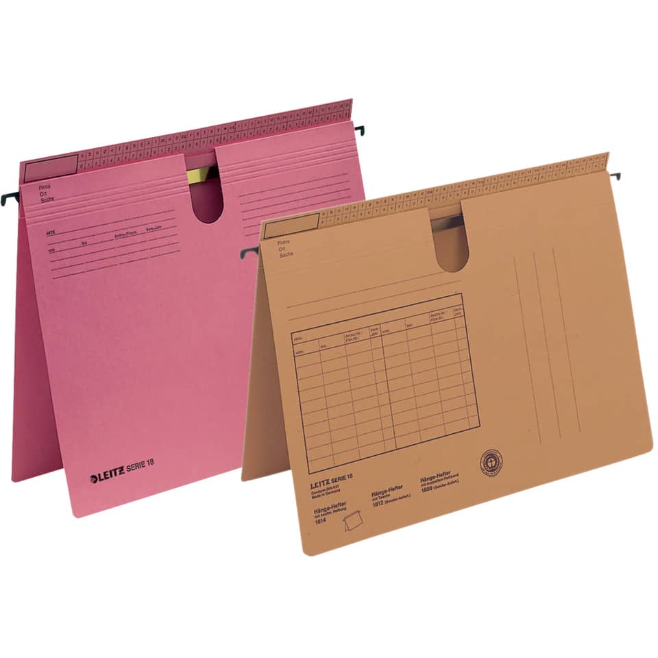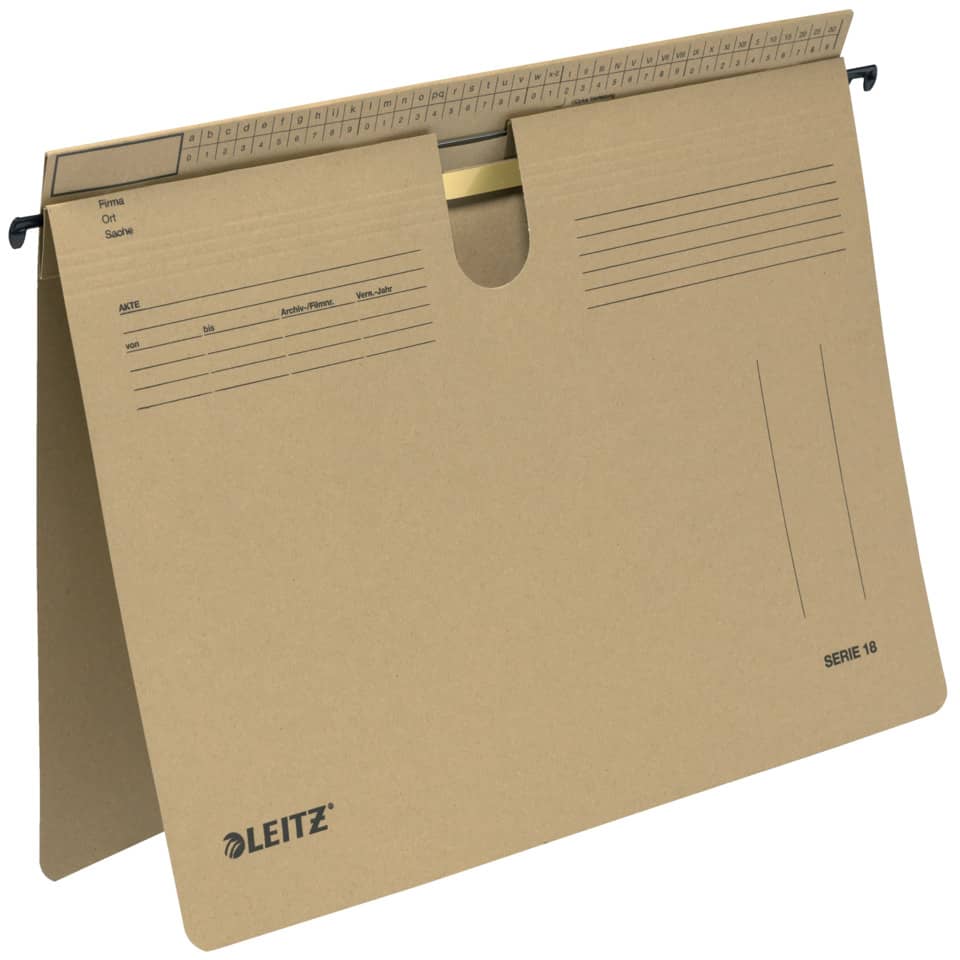 Leitz Hängehefter SERIE 18, für kaufmännische Heftung und Amtsheftung. Für die geheftete Ablage von Einzelakten. Überstehender Reiterfalz mit Organisationsdruck, links vorgedrucktes Feld für Beschriftung, auch geeignet für Farbcodierung mit OCplus Beschriftungsetiketten. Mit fest eingezacktem Aufreihband und Daumenausschnitt. Material: Natronkarton 250 g/qm (RC). Für A4. Farbe: naturbraun.