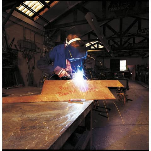Industrie Pastenmarker zum hochpermanenten Markieren auf besonders rostigen oder rauen Oberflächen von Materialien wie Metall, Stein und Holz. Die Farbpaste hat eine Strichbreite von bis zu 10 mm. Pastemarker mit wachsartiger Spitze zum Herausdrehen. Die stark deckende, hochpermanente Farbpaste ist wasser-und wischfest und extrem lichtbeständig. Markiert auch auf sauberen Untergründen unter Wasser.