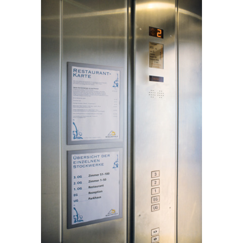 | Besonderheiten: | aufklappbarer Magnetrahmen für Format A4, selbstklebend, einfaches Anbringen auf glatten, tragfähigen Oberflächen ohne Hilfsmittel, doppelseitige Lesbarkeit an Glasflächen durch 2 Einlagen, anwendbar im Hoch- und Querformat |