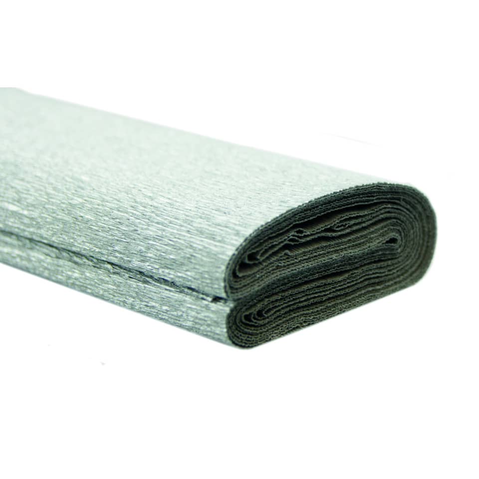 Krepppapier Silberkrepp. Flächenmasse des Papiers: 52 g/qm. Größe (B x L): 50 cm x 2,5 m. Farbe/Motiv: silber.
