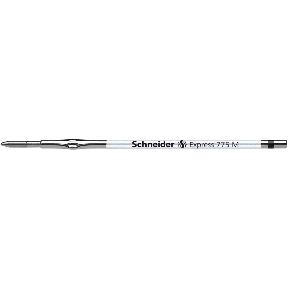 Kugelschreibermine EXPRESS 775. Verwendung für Produkt: Passend in alle Schneider Kugelschreiber-Modelle und Gelschreiber mit universeller Passform "Plug & Play", sowie viele am Markt befindliche Kugelschreiber mit X 20-System. Typbezeichnung der Mine: Standardmine in Premium-Ausführung. Ausführung Mine: M, schwarz, dokumentenecht. Typbezeichnung der Mine gemäß ISO-Norm: ISO 12757-2 H. Material des Schaftes: Metallmine. Länge: 107 mm. Die verschleißfeste Edelstahlspitze garantiert, dass der große Pasteninhalt vollständig und schmierfrei genutzt werden kann.