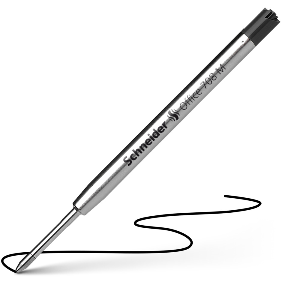 Kugelschreibermine Office 708. Verwendung für Produkt: Passend in alle Schneider Kugelschreiber-Modelle und Gelschreiber mit universeller Passform Plug+Play, sowie viele am Markt befindliche Kugelschreiber mit G2-System. Typbezeichnung der Mine: Internationale Großraummine im G2-Format. Ausführung Mine: M, schwarz, dokumentenecht. Typbezeichnung der Mine gemäß ISO-Norm: ISO 12757-2 G2. Material des Schaftes: Metall. Länge: 98 mm. Die verschleißfeste Edelstahlspitze garantiert, dass der große Pasteninhalt vollständig und schmierfrei genutzt werden kann.