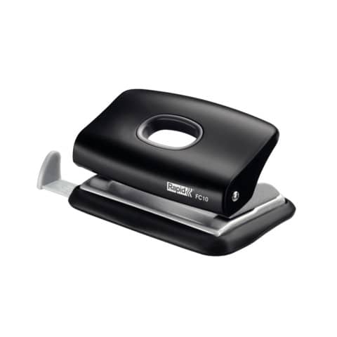 Rapid Bürolocher FC10, mit Anschlagschiene aus Kunststoff, Unterteil mit integriertem Abfallkasten. Stanzleistung/Blatt: 1mm/10. Material: ABS-Kunststoff. 5 Jahre Garantie. Farbe: schwarz.