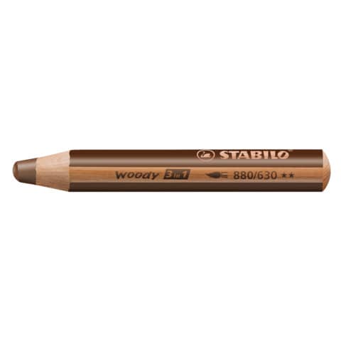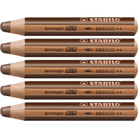 Multitalent-Stift STABILO® woody 3 in 1. Ausführung der Schaftform: rund. Farbe des Schaftes: in Minenfarbe. Schaft lackiert. Größe ( Ø x L): 15 x 100 mm. Buntstift, Wassermalfarbe und Wachsmalkreide in einem. Bruchsichere Mine. Ergiebige Farben. Hohe Deckkraft und Farbintensität, auch auf dunklen Papieren. Satter, samtweicher Abstrich. Malt auch auf glatten Oberflächen wie Glas, Metall, Leder etc.. Stärke der Mine: 10 mm. Schreibfarbe der Mine: braun