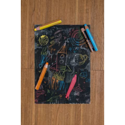 | Besonderheiten: | Buntstift, Wassermalfarbe und Wachsmalkreide in einem. Bruchsichere Mine. Ergiebige Farben. Satter, samtweicher Abstrich. Hohe Deckkraft und Farbintensität, auch auf dunklen Papieren. Malt auch auf glatten Oberflächen wie Glas, Metall, Leder etc |