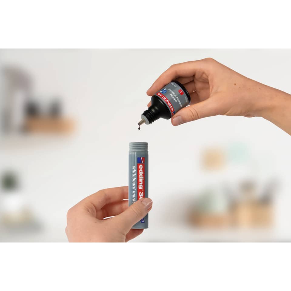 Verlängert die Lebensdauer fast aller edding Whiteboardmarker. Wenn keine Tinte mehr in einem edding Whiteboardmarker ist, kann der Marker schnell wieder zum Schreiben gebracht werden, indem er mindestens eine Stunde lang in die Nachfüllflasche gestellt wird. Das Nachfüllen der Marker hat nicht nur positive Auswirkungen auf die Umwelt, sondern spart gleichzeitig auch Geld. Geeignet für die edding Whiteboardmarker e-28, e-260, e-360 und e-365. Hochwertiges Markenprodukt, Made in Germany.