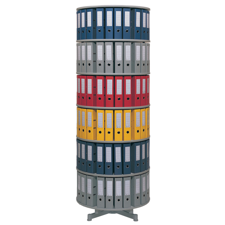 Für DIN A4-Ordner mit gemischtem Schriftgut. Säule leicht und geräuschlos komplett drehbar. Die nur an den Oberseiten der Etagenböden leicht erhöhte Kunststoffumrandung verhindert ein Herausrutschen der Ordner. Die Böden an den Unterseiten sind ohne Erhöhung, um die einzelnen Aktenordner bequem entnehmen zu können. Mit Standfuß. Rollen (bis zu 4 Etagen) als Zubehör.