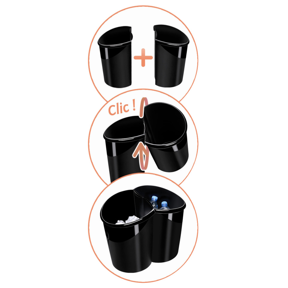 Eleganter Papierkorb in innovativem Design. Matte und glänzende Oberflächenbeschichtung. Geschwungener Rand und Halbmond-Form für komfortables Mülleinwerfen. Leichte Handhabung durch einen breiten, umlaufenden Griffrand. 2 Papierkörbe können zur Mülltrennung kombiniert werden. Schwarzer Papierkorb mit Blauer Engel ausgezeichnet. Fassungsvermögen : 15 Liter.