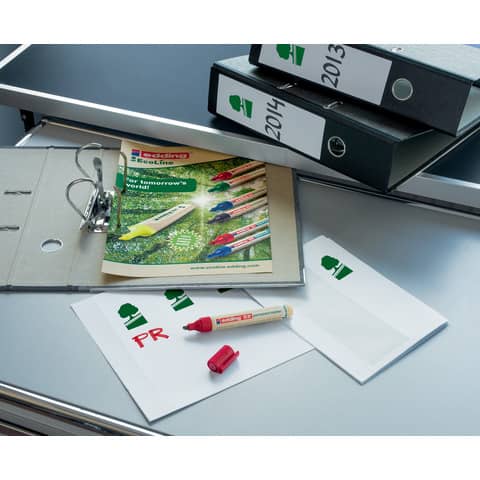 Permanentmarker 22 EcoLine. Nachfüllbar. Geruchsarme Tinte ohne Zusatz von Xylol/Toluol, wasserfest, lichtbeständig. Keilspitze, Spitze austauschbar. Kunststoffteile insgesamt zu mindestens 96% aus recyceltem Material. Papieretikett. Marker mit Filtersystem. Schnell trocknend. Zum Beschriften von fast allen Oberflächen. Kappe umsteckbar, Clip vorhanden. Kappe und Mundstück in Schreibfarbe. Schaftfarbe: umweltfreundliches Design. Strichstärke: ca. 1 - 5 mm. Schreibfarbe: rot.